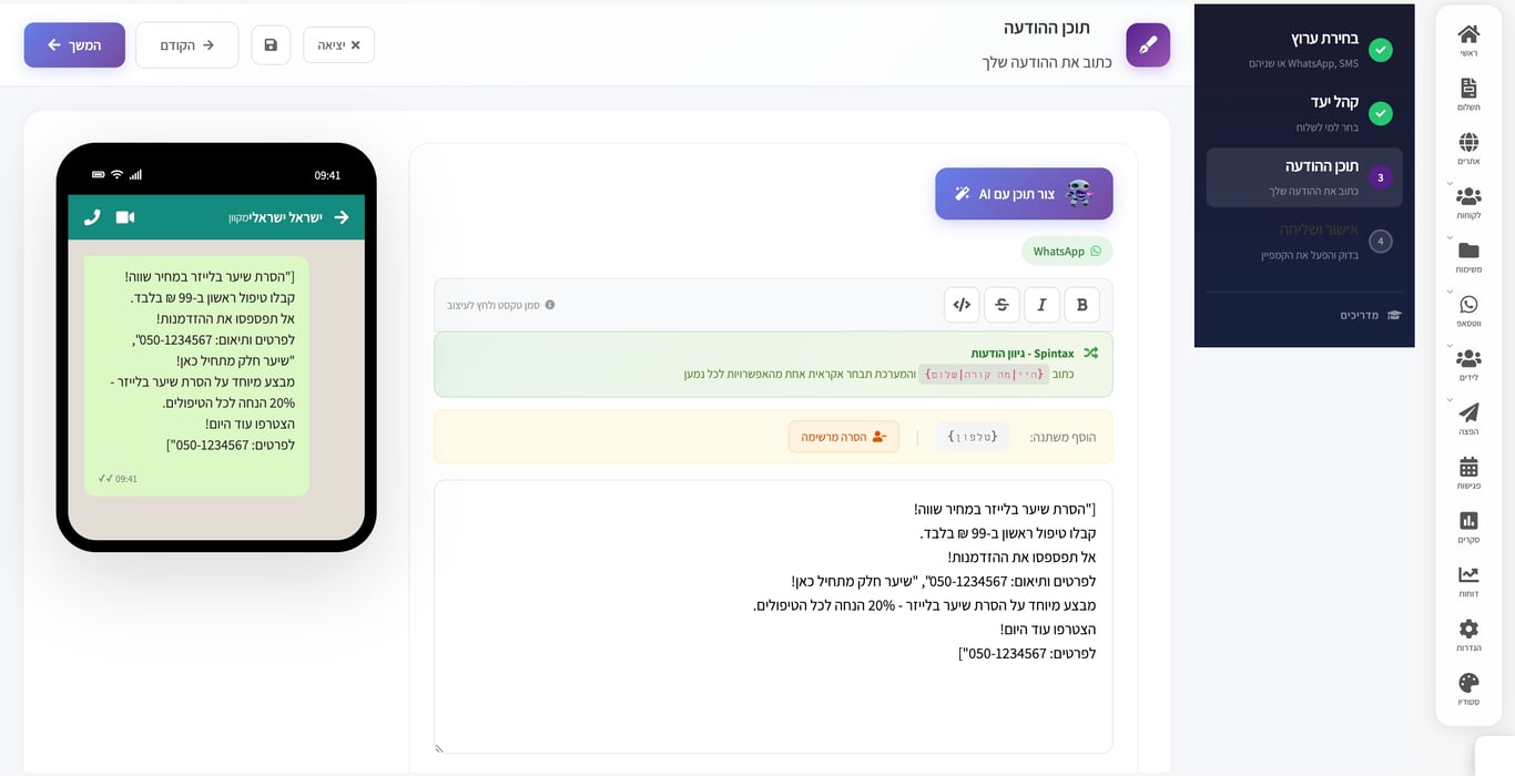 כולל AI חכם המנסח הודעות שיווקיות מדויקות עבורכם.